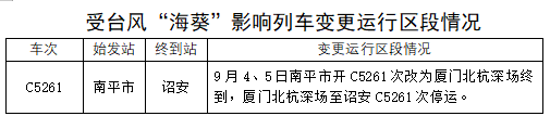 據(jù)中央氣象臺(tái)消息,今年第11號(hào)臺(tái)風(fēng)“??睂⒂?日凌晨到上午在福建漳浦至廣東惠來一帶沿海登陸,福建東部部分地區(qū)可能有大到暴雨,福建東南部部分地區(qū)有大暴雨,局地特大暴雨。為防范臺(tái)風(fēng)影響,保障運(yùn)輸安全,中國(guó)鐵路南昌局集團(tuán)有限公司調(diào)整部分旅客列車運(yùn)行方案,停運(yùn)途經(jīng)杭深線管內(nèi)漳州(不含)至詔安區(qū)段旅客列車。