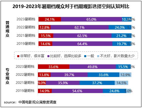 2023年7-8月新上映影片共80部,為近四年來(lái)同期最高值,滿意度調(diào)查的13部影片涵蓋劇情、動(dòng)畫、奇幻、懸疑、愛情、喜劇、動(dòng)作等多元類型,給觀眾帶來(lái)多樣化的觀影選擇。調(diào)研數(shù)據(jù)顯示,不同觀眾對(duì)于檔期觀影選擇空間均給予了好評(píng),普通觀眾、專業(yè)觀眾認(rèn)為檔期觀影選擇“非常好,很豐富”和“比較好,選擇比較多”的占比合計(jì)分別達(dá)89.2%、83.4%,均為近五年同期最高。