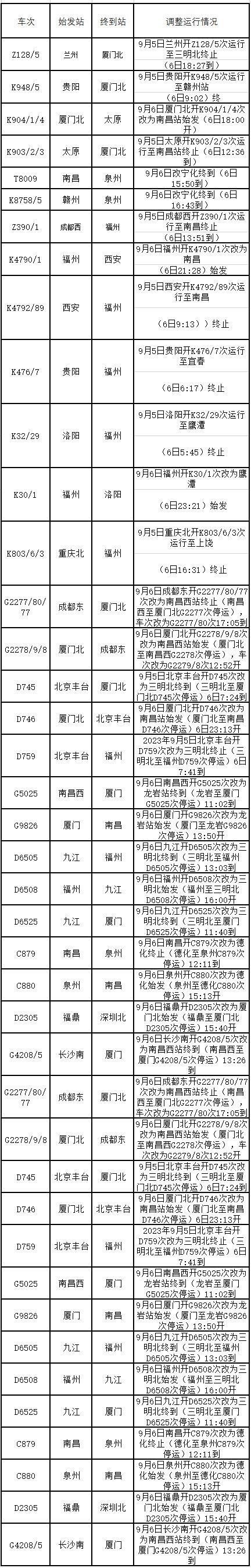 受臺風(fēng)“??睔堄喹h(huán)流影響,預(yù)計(jì)9月6日8時至7日8時,福建東部和南部、江西南部等地有大到暴雨,其中福建東南部沿海部分地區(qū)有大暴雨,局地有雷暴大風(fēng)等強(qiáng)對流天氣。為確保人民生命財(cái)產(chǎn)安全和鐵路運(yùn)輸安全,中國鐵路南昌局集團(tuán)有限公司(以下簡稱南鐵)調(diào)整9月6日、7日部分旅客列車運(yùn)行方案(具體見附件)。