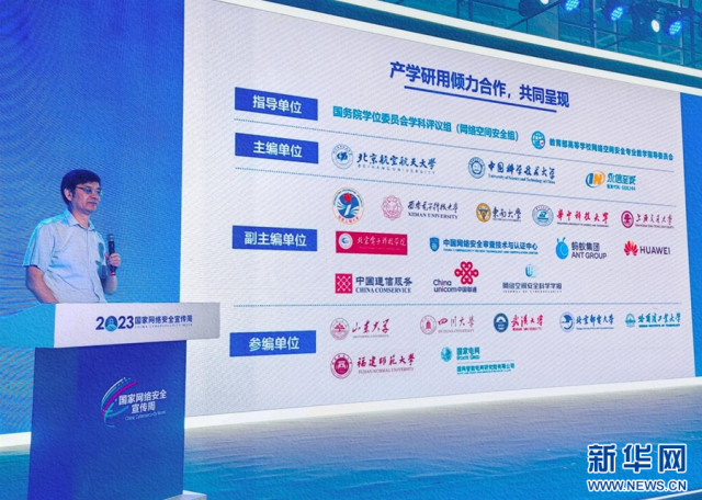 教育部高等學(xué)校網(wǎng)絡(luò)空間安全專業(yè)教學(xué)指導(dǎo)委員會(huì)副主任委員、中國科學(xué)技術(shù)大學(xué)網(wǎng)絡(luò)安全學(xué)院執(zhí)行院長俞能海在現(xiàn)場(chǎng)發(fā)布白皮書。新華網(wǎng)發(fā)(主辦方供圖)