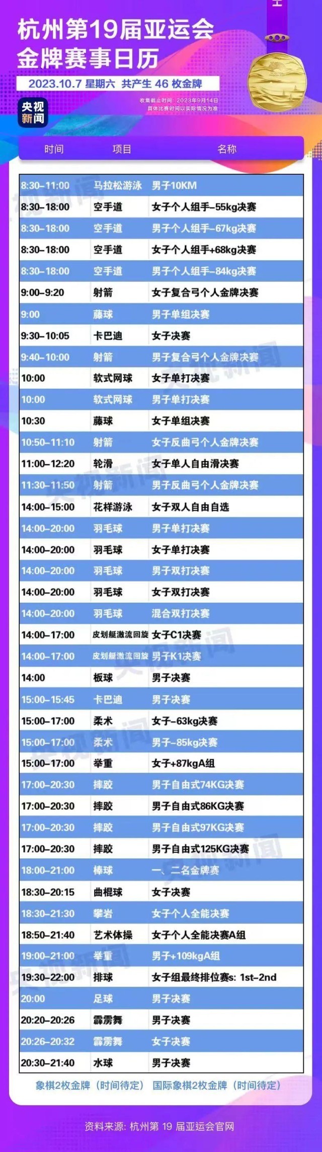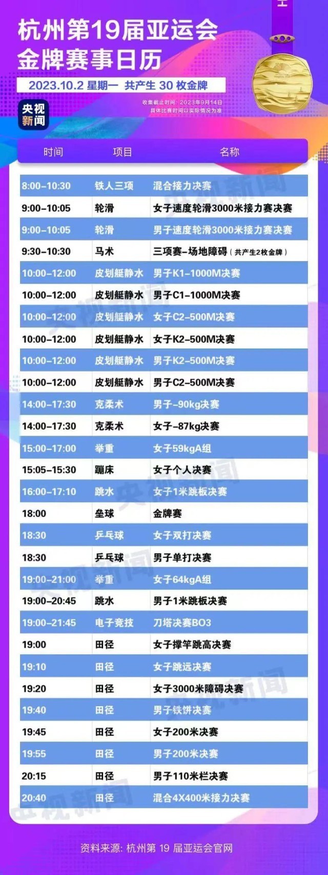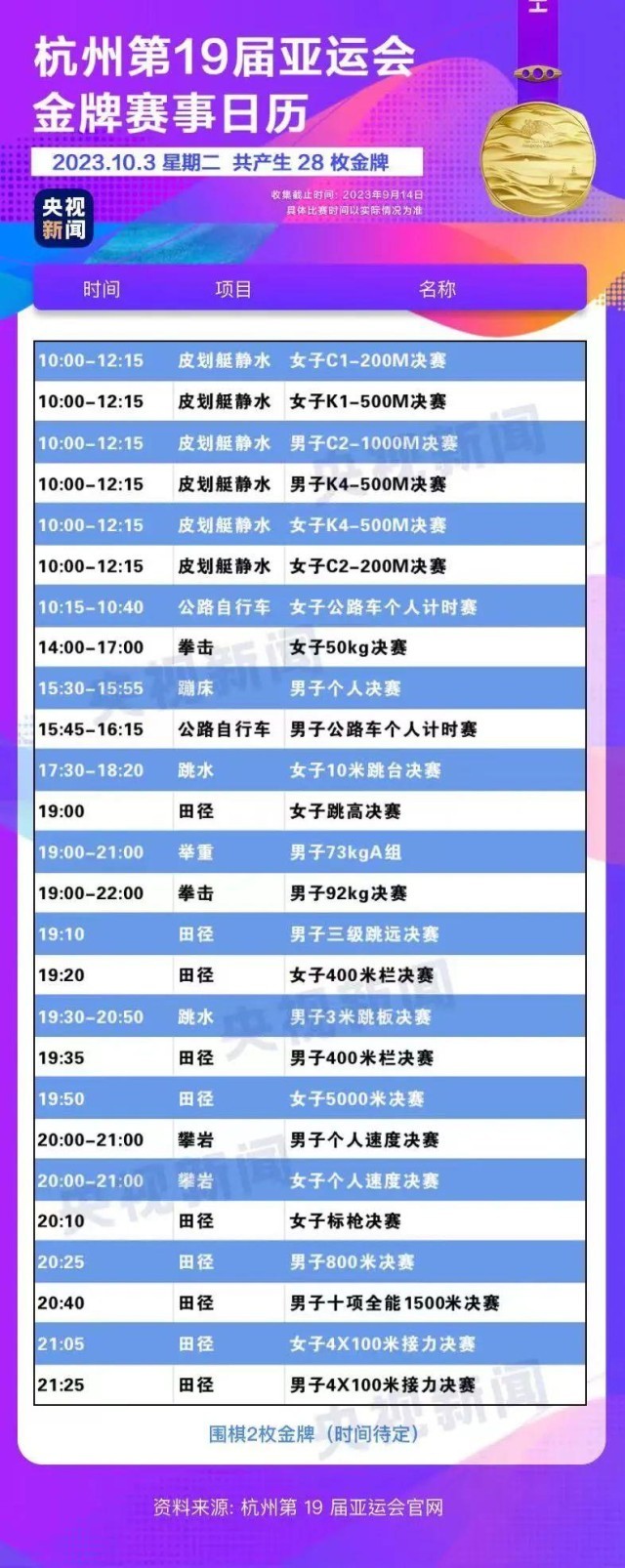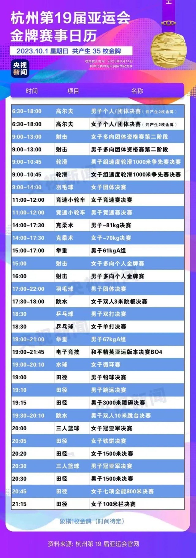 最后,小編還為你準(zhǔn)備了一份杭州亞運(yùn)會(huì)金牌賽事日歷,日歷里包含所有481枚金牌產(chǎn)生的時(shí)間。滑動(dòng)手指,看看你關(guān)注的比賽在哪天舉行。