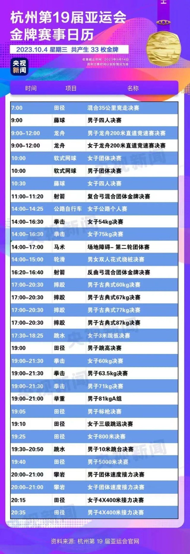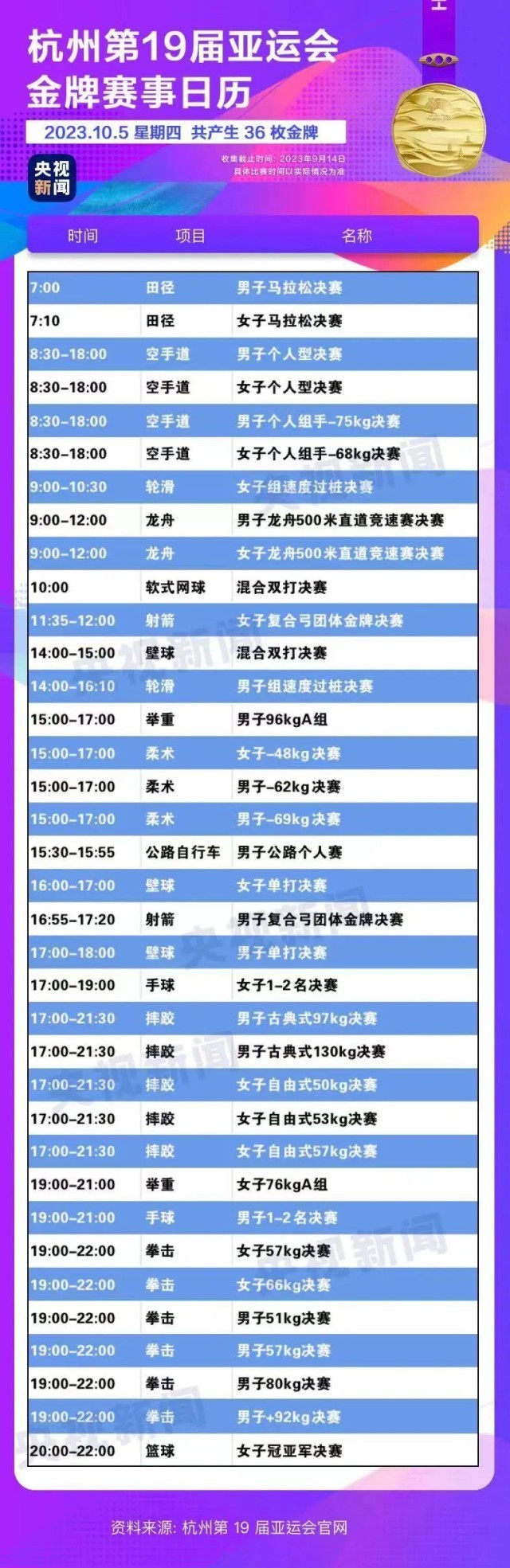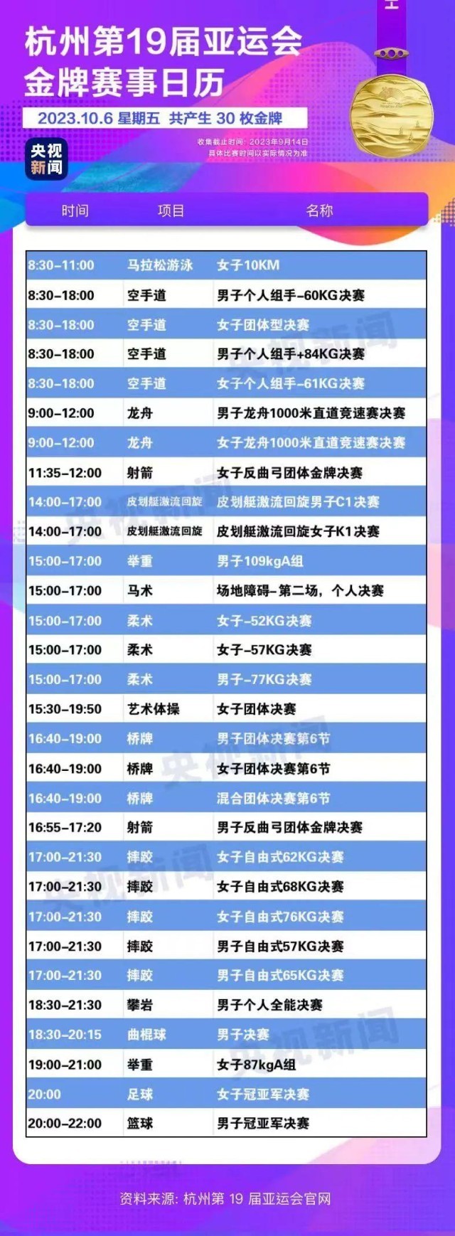最后,小編還為你準(zhǔn)備了一份杭州亞運(yùn)會(huì)金牌賽事日歷,日歷里包含所有481枚金牌產(chǎn)生的時(shí)間。滑動(dòng)手指,看看你關(guān)注的比賽在哪天舉行。