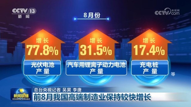 8月份,主要新能源產(chǎn)品兩位數(shù)增長,新能源汽車產(chǎn)量同比增長13.8%,帶動(dòng)光伏電池、汽車用鋰離子動(dòng)力電池、充電樁等產(chǎn)品產(chǎn)量分別增長77.8%、31.5%、17.4%;新材料產(chǎn)品生產(chǎn)保持高速增長,太陽能工業(yè)用超白玻璃、多晶硅、單晶硅等產(chǎn)品產(chǎn)量分別增長63.3%、84.6%、79.9%。