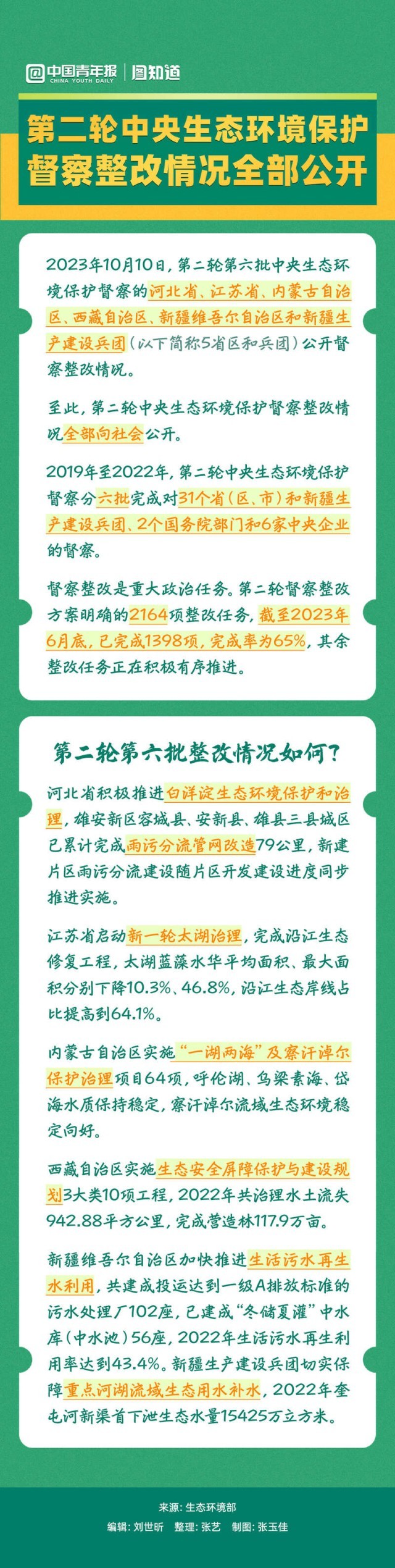 今年10月10日,第二輪第六批中央生態(tài)環(huán)境保護(hù)督察公開督察整改情況。至此,第二輪中央生態(tài)環(huán)境保護(hù)督察整改情況全部向社會公開。最新一批公布的整改情況如何?一圖讀懂。