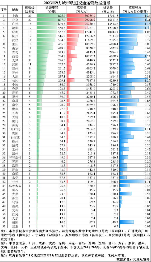 2023年9月,31個(gè)省(自治區(qū)、直轄市)和新疆生產(chǎn)建設(shè)兵團(tuán)共有55個(gè)城市開通運(yùn)營(yíng)城市軌道交通線路299條,運(yùn)營(yíng)里程9859.5公里,實(shí)際開行列車318萬列次,完成客運(yùn)量24.9億人次,進(jìn)站量14.9億人次。9月份,客運(yùn)量環(huán)比減少2.2億人次、降低8.2%,同比增加7.1億人次、增長(zhǎng)40%,較2019年月均客運(yùn)量增加5億人次、增長(zhǎng)24.9%。9月份客運(yùn)強(qiáng)度平均水平為0.536萬人次每公里日,較2019年全年客運(yùn)強(qiáng)度平均水平降低1.8%。