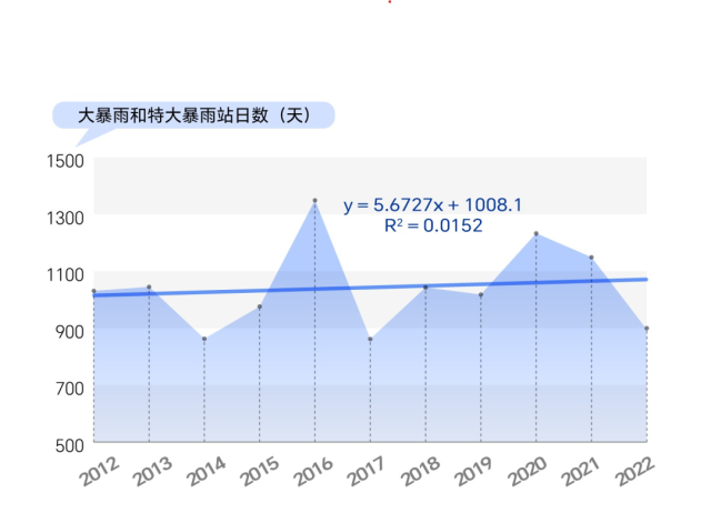 數(shù)據(jù)統(tǒng)計(jì)顯示,2012年至2022年,我國暴雨站日數(shù)有明顯的增加趨勢。這意味著,2012年到2022年,我國暴雨天氣過程的持續(xù)時間或影響范圍有增加(擴(kuò)大)的趨勢。