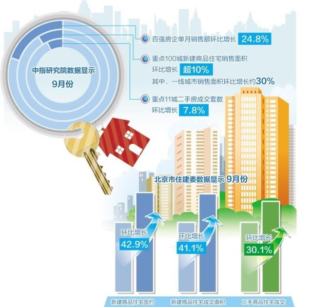隨著需求釋放動(dòng)能減弱,9月后兩周成交量明顯下降。北京市住建委數(shù)據(jù)顯示,9月份,北京新建商品住宅簽約5891套,成交面積67.96萬平方米,環(huán)比分別增長(zhǎng)42.9%和41.1%;二手商品住宅成交14262套,環(huán)比增長(zhǎng)30.1%。