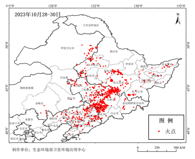10月28–30日東北地區(qū)秸稈焚燒火點分布圖