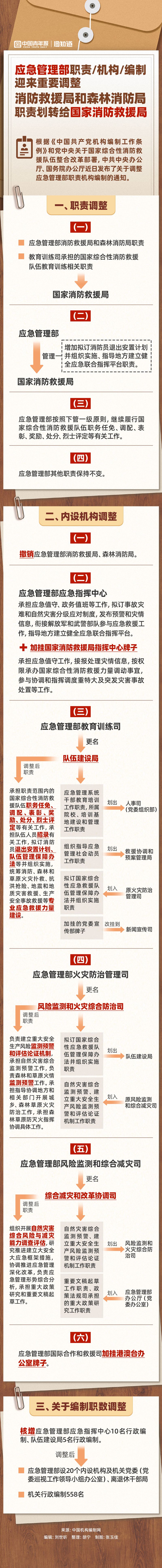 2023年1月6日,由應急管理部消防救援局和森林消防局整合而成的國家消防救援局正式掛牌。10月31日,中國機構編制網(wǎng)發(fā)布了應急管理部職責、機構、編制調(diào)整的有關通知及最新的《國家消防救援局職能配置、內(nèi)設機構和人員編制規(guī)定》。應急管理部相關機構和職責等如何調(diào)整?一圖查看。