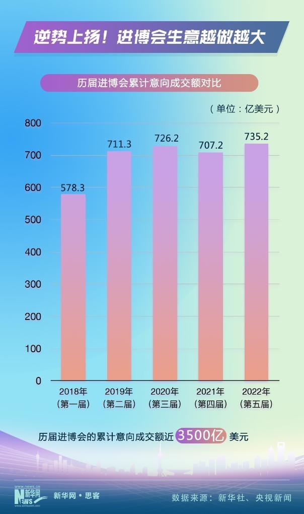 2018年11月,首屆進博會在上?!俺踉囂渎暋?。之后,進博會不顧風雨和險阻,年年如約而至、越辦越好。數(shù)據(jù)顯示,進博會的累計意向成交額從2018年的578.3億美元,上升到2022年的735.2億美元。前五屆進博會的累計意向成交額近3500億美元。進博會生意越做越大。
