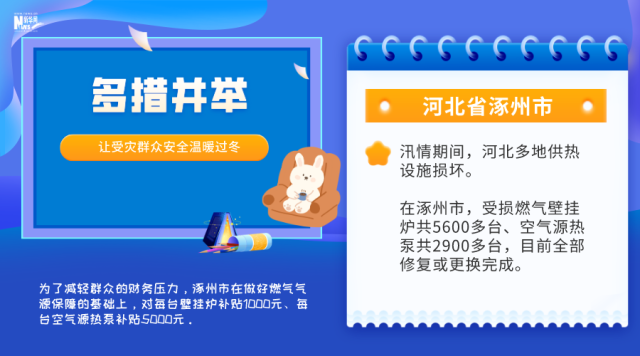 汛情期間,河北多地供熱設(shè)施損壞。在涿州市,受損燃?xì)獗趻鞝t共5600多臺、空氣源熱泵共2900多臺,目前全部修復(fù)或更換完成。為了減輕群眾的財務(wù)壓力,涿州市在做好燃?xì)鈿庠幢U系幕A(chǔ)上,對每臺壁掛爐補貼1000元、每臺空氣源熱泵補貼5000元。在河北保定淶水縣,10個位于山區(qū)、丘陵的鄉(xiāng)鎮(zhèn)今冬要使用潔凈煤取暖,預(yù)計使用量在5.1萬噸左右。淶水縣督促相關(guān)企業(yè),早謀劃、早對接、早儲備,組織車輛加快配送,確保供得上、供得及時。