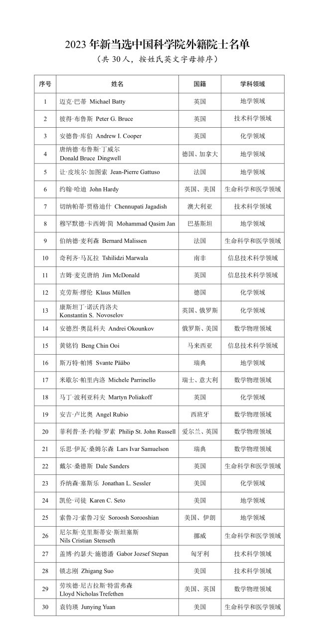 中國青年報客戶端北京11月23日電(中青報·中青網(wǎng)見習(xí)記者 楊潔 記者 邱晨輝)今天,中國科學(xué)院、中國工程院分別公布2023年院士增選當選外籍院士名單,中國科學(xué)院選舉產(chǎn)生30名外籍院士,中國工程院選舉產(chǎn)生16名外籍院士,共計46人當選。