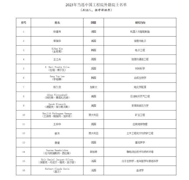 中國工程院2023年當選外籍院士名單。中國工程院官網(wǎng)圖