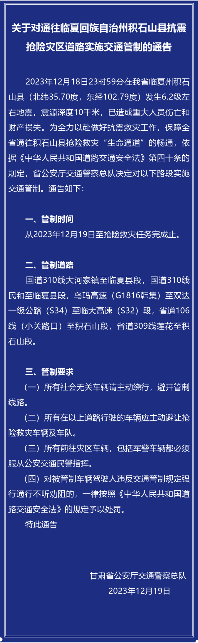 2023年12月18日23時59分在甘肅省臨夏州積石山縣發(fā)生6.2級左右地震,已造成重大人員傷亡和財產損失。為全力以赴做好抗震救災工作,保障甘肅全省通往積石山縣搶險救災“生命通道”的暢通,甘肅省公安廳交通警察總隊對抗震搶險災區(qū)道路實施交通管制,至搶險救災任務完成止,詳情如下: