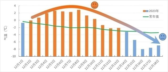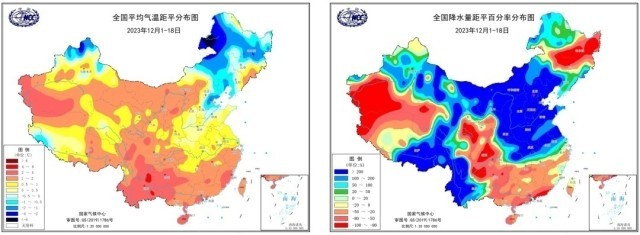 今年12月上旬偏暖顯著,月中降溫幅度大。12月以來(lái)(截至18日)北方大部地區(qū)降水顯著偏多。這期間,全國(guó)平均氣溫-1.3℃,較常年同期偏高0.9℃,全國(guó)大部地區(qū)氣溫以偏高為主。