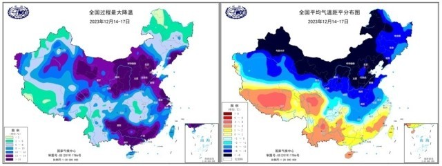 12月14-17日全國(guó)大部降溫迅猛(左)氣溫遠(yuǎn)低于歷史同期(右,“距平”為實(shí)測(cè)數(shù)據(jù)與歷史同期之差)