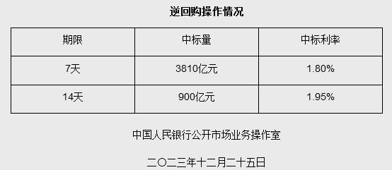 中新網(wǎng)12月25日電 據(jù)央行網(wǎng)站消息,為維護(hù)年末流動性合理充裕,2023年12月25日人民銀行以利率招標(biāo)方式開展了4710億元7天期和14天期逆回購操作。具體情況如下: