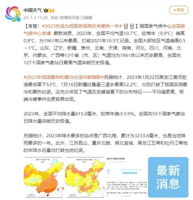 央視網消息:中國天氣 援引國家氣候中心國家氣候中心官博 最新消息,2023年,全國平均氣溫10.7℃,較常年(9.9℃)偏高0.8℃,為1961年以來最高,打破2021年10.5℃記錄。全國大部地區(qū)氣溫偏高0.5~1℃。山東、遼寧、新疆、貴州、云南、天津、湖南、河北、四川、河南、北京、內蒙古、廣西等13個?。ㄊ小^(qū))氣溫均為1961年以來歷史最高,全國共127個國家氣象站日最高氣溫突破歷史極值。