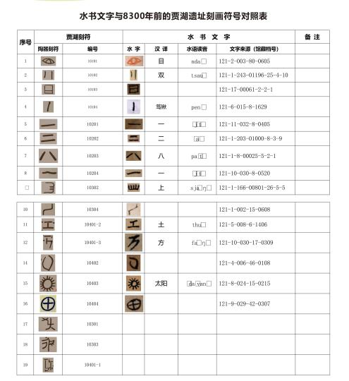 中國貴州省黔南布依族苗族自治州水書申報《世界記憶遺產(chǎn)名錄》領導小組辦公室、黔南州檔案館最新研究發(fā)現(xiàn),中國水書文字與中國河南省偃師市二里頭夏都遺址出土的24個刻畫符號相同,與中國浙江省良渚文化遺址出土的700多個刻畫符號中的104個符號相同,與中國安徽省蚌埠市雙墩遺址出土的600多個刻畫符號中的73個符號相同,與中國河南省賈湖遺址出土的19個刻畫符號中的16個符號相同。