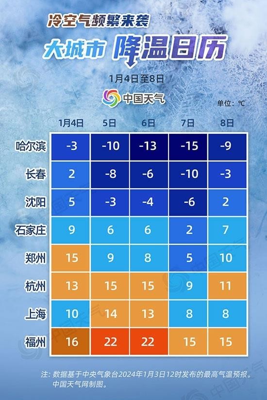 從這份大城市降溫日歷來看,5日開始,受冷空氣影響,降溫將自北向南展開,東北地區(qū)降溫最猛且連降三天,沈陽、長春的最高氣溫將重回冰點之下。近期已成為旅游熱門地的哈爾濱,降溫最為猛烈,6日至7日,最低氣溫將在-25℃左右,最高氣溫跌至近期低點,達-15℃左右,天寒地凍一整天。近期有計劃去當?shù)赜瓮娴哪戏叫』锇閭?,一定要帶好厚衣服,戶外活動帽子、手套、雪地靴從頭到腳捂嚴實。