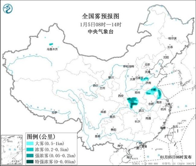 預(yù)計(jì),5日早晨至上午,河北南部、山東西北部、江蘇中北部、安徽北部、河南南部、湖北北部等地的部分地區(qū)有大霧,其中江蘇中北部、河南南部、湖北北部等地的部分地區(qū)有能見(jiàn)度低于200米的強(qiáng)濃霧,局地有能見(jiàn)度低于低于50米的特強(qiáng)濃霧。