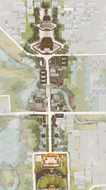 全長(zhǎng)7.8公里的北京中軸線北端為鐘鼓樓,向南經(jīng)過萬寧橋、景山、故宮、端門、天安門、外金水橋、天安門廣場(chǎng)及建筑群、正陽門、中軸線南段道路遺存,至南端永定門;太廟和社稷壇、天壇和先農(nóng)壇東西對(duì)稱布局于兩側(cè)。