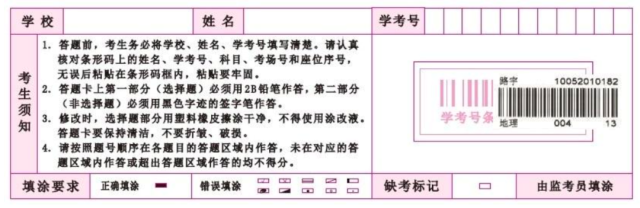 3.答題前要仔細閱讀答題卡上的“考生須知”。務必用黑色字跡的簽字筆將答題卡左上角的學校名稱、姓名、學考號填寫清楚,字跡不能超出框線,如下圖: