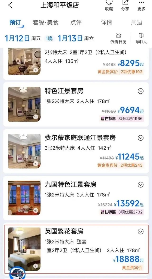 劇中出鏡率極高的和平飯店英國套房也成了“熱門產(chǎn)品”。目前,和平飯店英國套房在旅游平臺上被命名為“英國繁花套房”。9日查詢攜程旅行平臺發(fā)現(xiàn),9-11日該套房已售罄,12日入住一晚的價格為18888元。據(jù)媒體此前報(bào)道,這一套房在今年春節(jié)期間含早價為22888元一晚。
