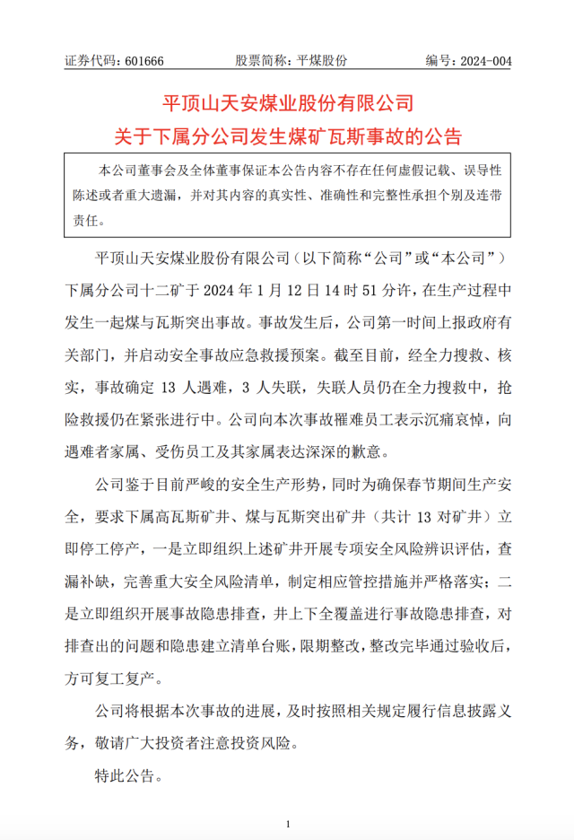 央視網(wǎng)消息:1月14日,平煤股份發(fā)布公告,下屬分公司十二礦于2024年1月12日14時51分許,在生產(chǎn)過程中發(fā)生一起煤與瓦斯突出事故。事故發(fā)生后,公司第一時間上報政府有關(guān)部門,并啟動安全事故應(yīng)急救援預(yù)案。截至目前,經(jīng)全力搜救、核實,事故確定13人遇難,3人失聯(lián),失聯(lián)人員仍在全力搜救中,搶險救援仍在緊張進行中。公司向本次事故罹難員工表示沉痛哀悼,向遇難者家屬、受傷員工及其家屬表達(dá)深深的歉意。