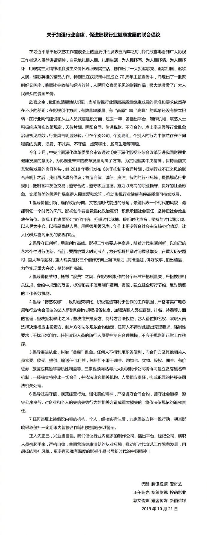 為了避免娛樂圈的爭番、攀比等亂象,業(yè)界公司曾聯(lián)合發(fā)布自律倡議。2019年,優(yōu)酷、騰訊視頻、愛奇藝三家視頻網(wǎng)站,聯(lián)合正午陽光、華策影視、檸萌影業(yè)、慈文傳媒、耀客傳媒、新麗傳媒六大影視制作公司,共同發(fā)布《關(guān)于加強(qiáng)行業(yè)自律,促進(jìn)影視行業(yè)健康發(fā)展的聯(lián)合倡議》。