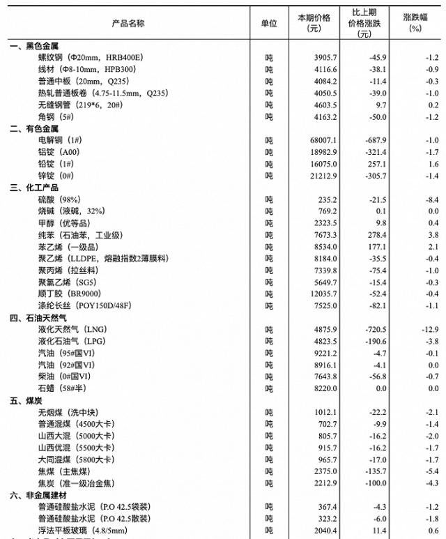 央視網(wǎng)消息:國家統(tǒng)計(jì)局發(fā)布2024年1月中旬流通領(lǐng)域重要生產(chǎn)資料市場(chǎng)價(jià)格變動(dòng)情況,詳情如下: