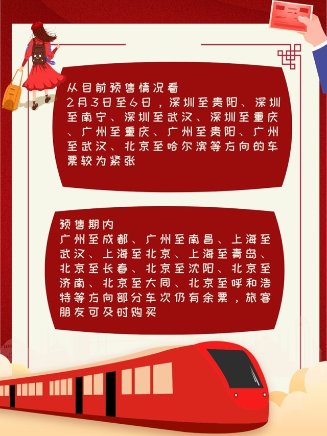 從目前預(yù)售情況看,2月3日至6日,深圳至貴陽、深圳至南寧、深圳至武漢、深圳至重慶、廣州至重慶、廣州至貴陽、廣州至武漢、北京至哈爾濱等方向的車票較為緊張。預(yù)售期內(nèi),廣州至成都、廣州至南昌、上海至武漢、上海至北京、上海至青島、北京至長(zhǎng)春、北京至沈陽、北京至濟(jì)南、北京至大同、北京至呼和浩特等方向部分車次仍有余票,旅客朋友可及時(shí)購(gòu)買。