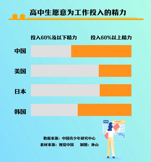 對于未來的工作,受訪高中生愿意投入多少精力?調(diào)查發(fā)現(xiàn),假設(shè)全部精力是100%,愿意為工作投入80%以上精力的中國高中生占比16.2%,愿意投入60%到80%精力的高中生占比43.8%,合計(jì)有六成受訪中國高中生愿意為工作投入60%以上精力,在四國受訪高中生中最高,其次是韓國高中生(53.3%),美國和日本高中生愿意投入60%以上精力的比例均只有三成多(32.4%和31.6%)??梢?,中國和韓國高中生更愿意投入較多精力在工作上。
