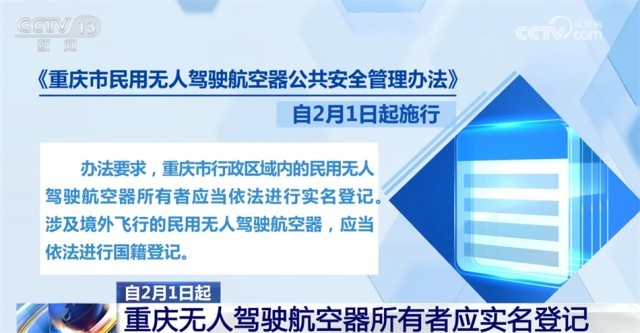 《重慶市民用無人駕駛航空器公共安全管理辦法》自2月1日起施行。辦法要求,重慶市行政區(qū)域內的民用無人駕駛航空器所有者應當依法進行實名登記。涉及境外飛行的民用無人駕駛航空器,應當依法進行國籍登記。