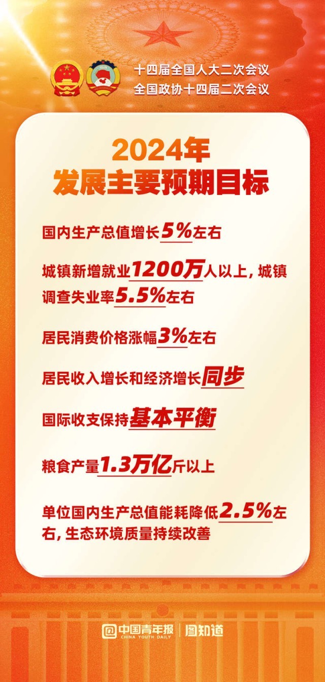 國內(nèi)生產(chǎn)總值增長(zhǎng)5%左右,城鎮(zhèn)新增就業(yè)1200萬人以上,糧食產(chǎn)量1.3萬億斤以上......2024年發(fā)展主要預(yù)期目標(biāo)公布,向著這些目標(biāo)共同奮斗!