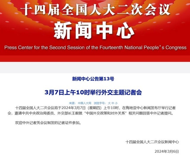 十四屆全國人大二次會(huì)議將于2024年3月7日(星期四)上午10時(shí),在梅地亞中心新聞發(fā)布廳舉行記者會(huì),邀請(qǐng)中共中央政治局委員、外交部長王毅就“中國外交政策和對(duì)外關(guān)系”相關(guān)問題回答中外記者提問。