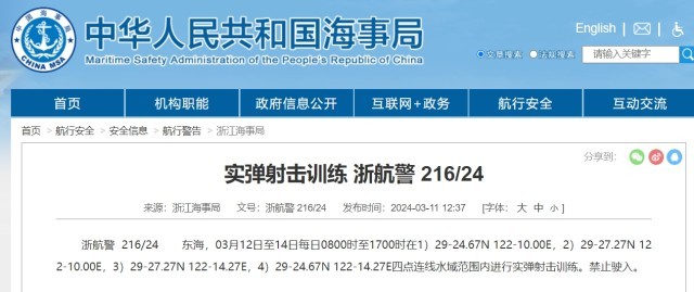 央視網(wǎng)消息:據(jù)中國海事局網(wǎng)站消息,浙江海事局發(fā)布航行警告,3月12日至14日每日8時至17時,東海部分水域進(jìn)行實彈射擊訓(xùn)練,禁止駛?cè)搿?/p>