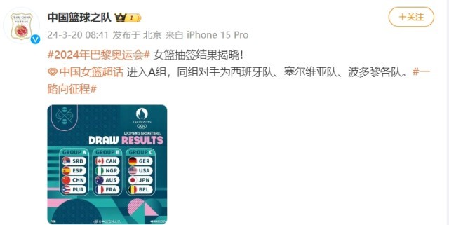 央視網(wǎng)消息:據(jù)中國籃球之隊(duì)官方微博消息,2024年巴黎奧運(yùn)會(huì)女籃抽簽結(jié)果揭曉!中國女籃進(jìn)入A組,同組對手為西班牙隊(duì)、塞爾維亞隊(duì)、波多黎各隊(duì)。