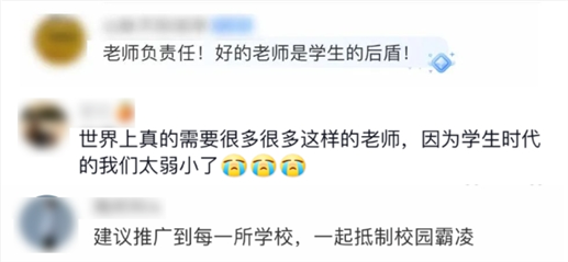 這位老師的做法,贏得了眾多網(wǎng)友的點贊:“好老師是學生的后盾”“一起抵制校園霸凌”。