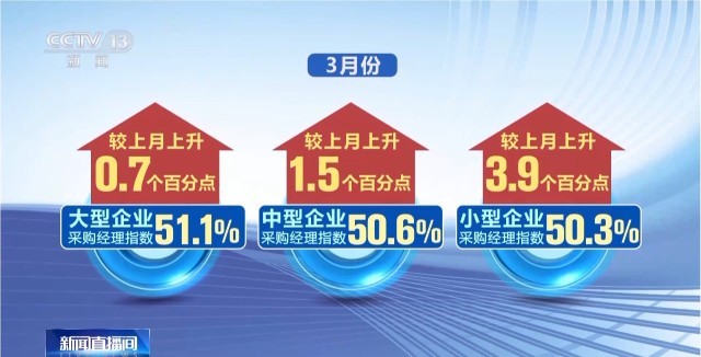3月份,大中小型企業(yè)采購(gòu)經(jīng)理指數(shù)分別為 51.1%、50.6%和50.3%,較上月分別上升0.7、1.5和3.9個(gè)百分點(diǎn),不同規(guī)模企業(yè)生產(chǎn)經(jīng)營(yíng)狀況均有所改善。