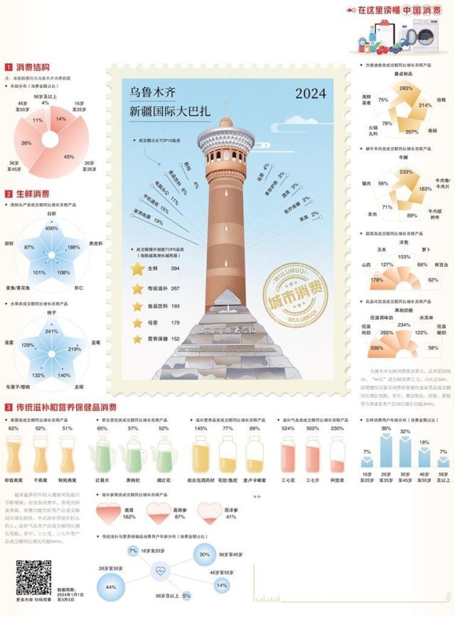 觀察、梳理和分析當(dāng)?shù)叵M數(shù)據(jù),可以看出,烏魯木齊消費市場持續(xù)升溫,特別是春節(jié)期間,消費潛能得到充分釋放,呈現(xiàn)飲食消費升級等新趨勢。