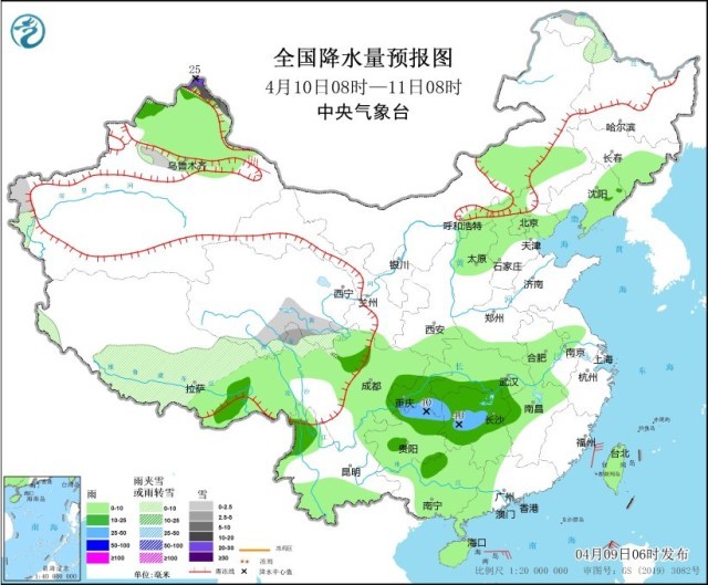 4月9日08時至10日08時,內(nèi)蒙古東北部、黑龍江西北部、新疆北疆北部和伊犁河谷、西藏北部和西部、青海中部和北部、川西高原北部等地部分地區(qū)有小到中雪或雨夾雪,其中,新疆北疆北部等地局部有大到暴雪(10~18毫米)。新疆北部、內(nèi)蒙古中部、華北北部、西藏中部和東南部、青海東部、甘肅中部和南部、寧夏、陜西北部和西南部、四川盆地大部、重慶、湖北西部、貴州北部、湖南北部、云南西部和東南部、廣西東南部、海南島、臺灣島等地部分地區(qū)有小到中雨,其中,西藏東南部局地有大雨(25~30毫米)。新疆北疆沿天山地區(qū)、甘肅西部、內(nèi)蒙古西北部、黑龍江東北部、西藏中部等地部分地區(qū)有4~6級風(fēng)。東海大部海域、臺灣海峽、臺灣以東洋面、巴士海峽、南海東北部海域?qū)⒂?~7級、陣風(fēng)8級的風(fēng),其中臺灣海峽的部分海域風(fēng)力可達(dá)8級、陣風(fēng)9級。