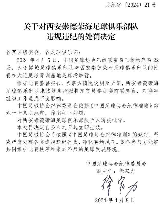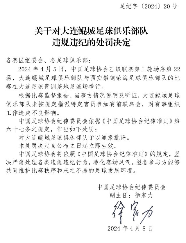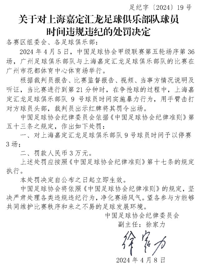 央視網(wǎng)消息:4月10日,中國足協(xié)網(wǎng)站發(fā)布《關于對上海嘉定匯龍足球俱樂部隊球員時間違規(guī)違紀的處罰決定》《關于對西安崇德榮海足球俱樂部隊違規(guī)違紀的處罰決定》《關于對大連鯤城足球俱樂部隊違規(guī)違紀的處罰決定》三份處罰決定。中甲聯(lián)賽上海嘉定匯龍9號球員因暴力行為被停賽罰款。中乙聯(lián)賽大連鯤城與西安崇德榮海兩家俱樂部因未按規(guī)定指派特定官員參加賽前聯(lián)席會,被通報批評。
