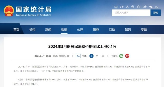 國(guó)家統(tǒng)計(jì)局:3月份居民消費(fèi)價(jià)格同比上漲0.1%