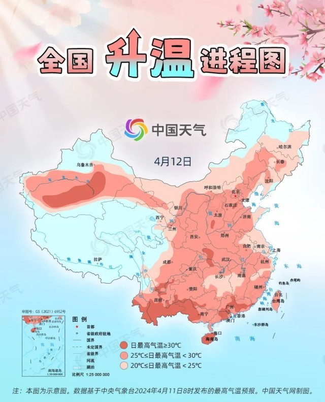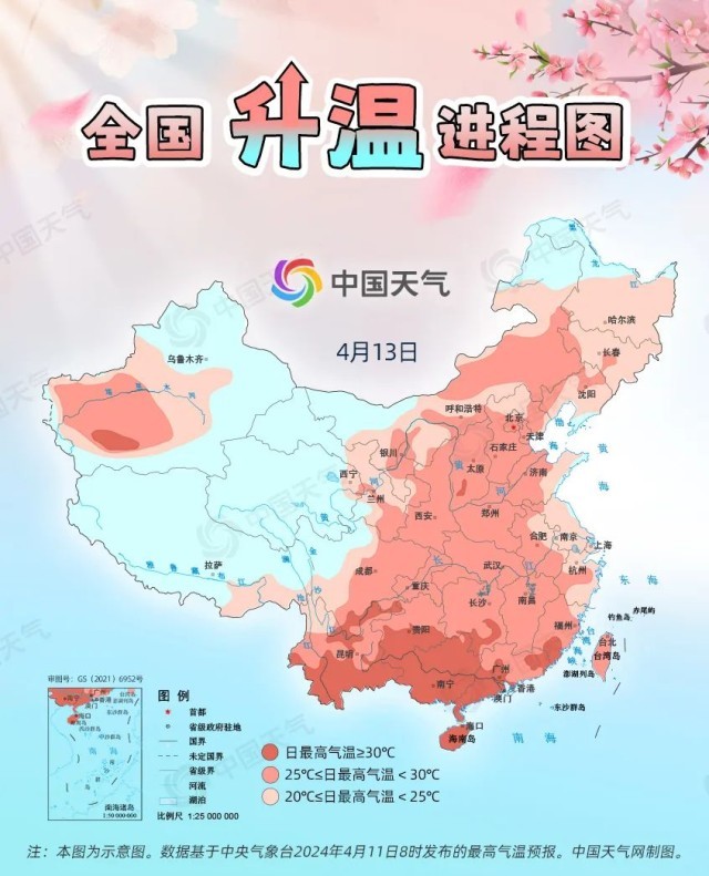 眼下,全國大部處于冷空氣影響間歇期,升溫是主旋律。預(yù)計今起三天(4月11日至13日),我國從北到南都將開啟回暖進(jìn)程,最高氣溫25℃以上的區(qū)域幾乎覆蓋整個中東部,波及20余省份,東北、西北地區(qū)氣溫將大面積創(chuàng)今年以來新高,北方不少地方還會體驗到常年5月中旬才有的超前暖熱。中國天氣網(wǎng)推出全國升溫進(jìn)程圖,看看哪些地方將沖擊30℃。
