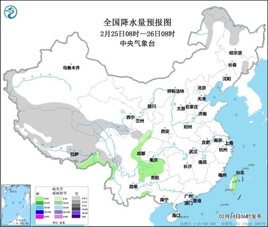 25日,內(nèi)蒙古東北部、黑龍江西北部、新疆南疆西部和南部、西藏大部、青海南部等地部分地區(qū)有小到中雪或雨夾雪。西藏東南部、四川盆地西部、貴州中西部、云南東部、臺灣島等地部分地區(qū)有小雨(見圖2)。西藏南部、內(nèi)蒙古中西部、東北地區(qū)南部、華北北部、黃淮東部等地部分地區(qū)有4~6級風。