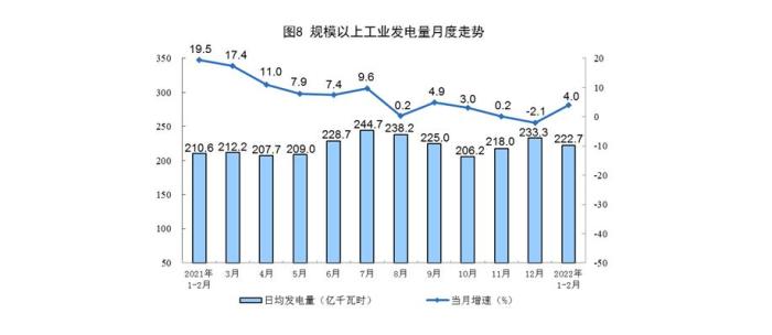 電力生產由降轉升。1—2月份,發(fā)電量13141億千瓦時,同比增長4.0%,上年12月份為下降2.1%,日均發(fā)電222.7億千瓦時。