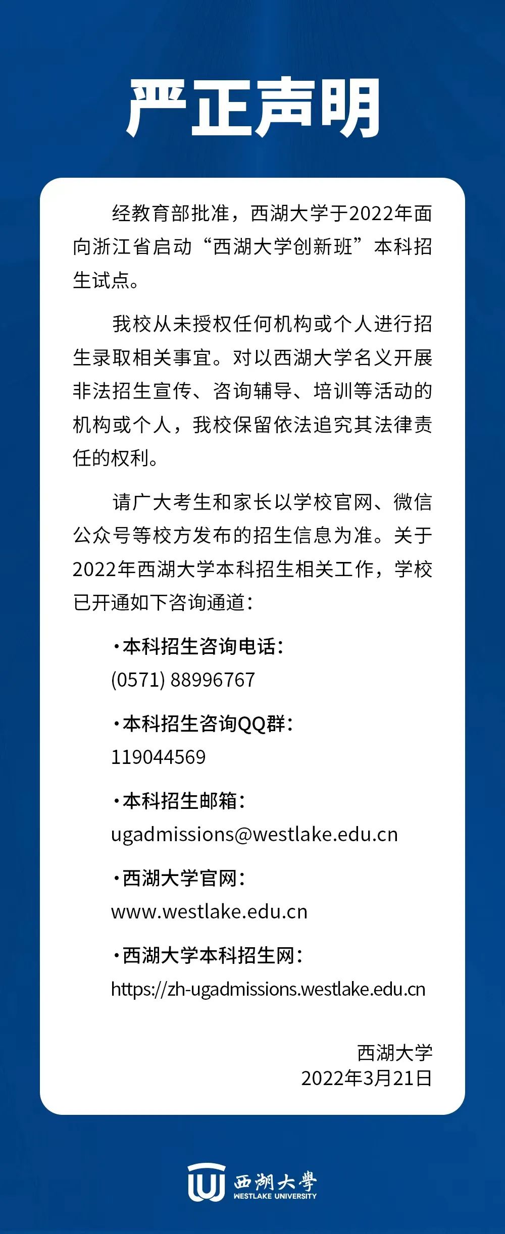 中新網(wǎng)3月21日電 據(jù)“西湖大學(xué)WestlakeUniversity”微信公眾號消息,3月21日,西湖大學(xué)發(fā)布《關(guān)于2022年西湖大學(xué)本科招生的嚴正聲明》,聲明指出,經(jīng)教育部批準,西湖大學(xué)于2022年面向浙江省啟動“西湖大學(xué)創(chuàng)新班”本科招生試點。該校從未授權(quán)任何機構(gòu)或個人進行招生錄取相關(guān)事宜。對以西湖大學(xué)名義開展非法招生宣傳、咨詢輔導(dǎo)、培訓(xùn)等活動的機構(gòu)或個人,該校保留依法追究其法律責(zé)任的權(quán)利。