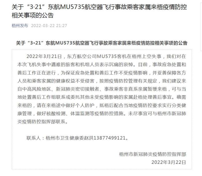 中新網(wǎng)3月22日電 據(jù)“梧州發(fā)布”微信公眾號消息,3月22日,梧州市新冠肺炎疫情防控指揮部發(fā)布通告稱,2022年3月21日,東方航空公司MU5735客機(jī)在梧州上空失事。目前,事故應(yīng)急處置和善后工作正在進(jìn)行,為保證應(yīng)急處置和善后工作不受疫情影響,并妥善保障各方人員和乘客家屬的健康權(quán)益不受侵害,按照疫情防控管理有關(guān)規(guī)定,我們建議來自中高風(fēng)險(xiǎn)地區(qū)、新冠肺炎密切接觸者、事故乘客非直系親屬暫緩來梧,可與當(dāng)?shù)靥幹蒙坪蠊ぷ鹘M聯(lián)系或委托其他未受疫情影響的家屬赴梧處理善后事宜。