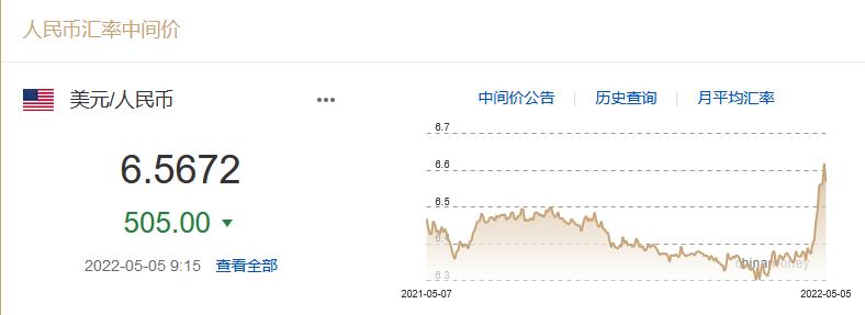 5月5日人民幣對(duì)美元匯率中間價(jià)較上日上調(diào)505點(diǎn)